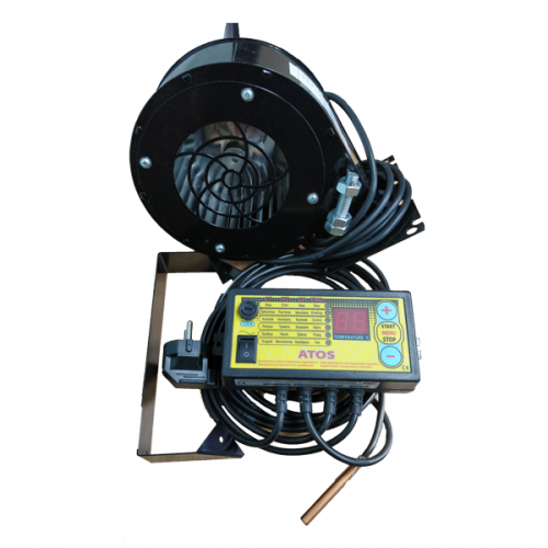 Комплект автоматики для котлів на твердому ATOS (АТОС) - включає в себе: блок управління і нагнітальний вентилятор. Призначений для установки на твердопаливні кот-ли з ручним завантаженням. Мікропроцесор (блок керування) відповідає за підтримання заданої температури, шляхом включення або відключення турбіни і насоса ЦО. Турбіна служить для примусової подачі повітря в топку котла, збільшуючи інтенсивність або сповільнюючи процес горіння.